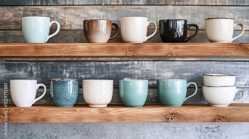 Collection of Ceramic Cups: A neatly arranged collection of various colored ceramic cups and mugs rests on rustic wooden shelves, creating a visually appealing and organized display.