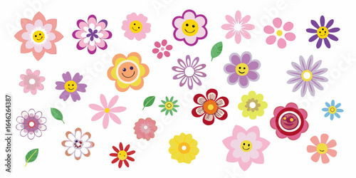 Collection of cheerful cartoon flowers with smiley faces and leaves