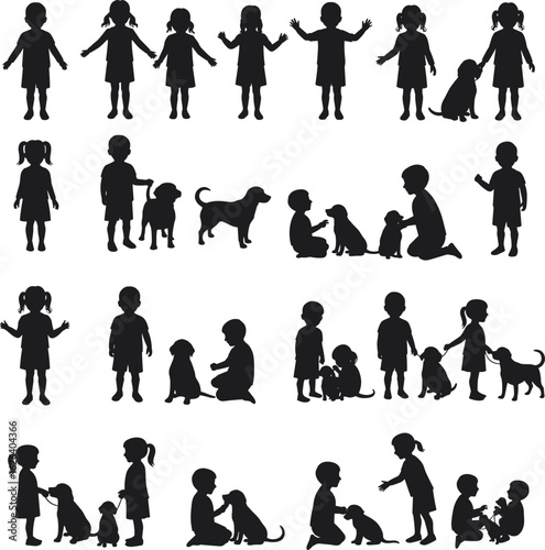 Collection of Children Silhouettes Playing with Dogs, Showing a Variety of Poses and Interactions Between Kids and Their Pets, Vector Illustration .