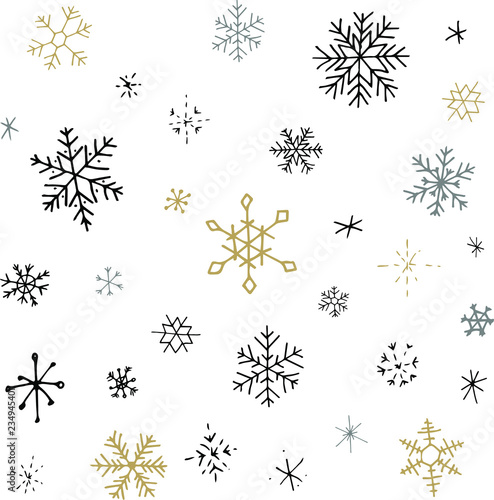 Collection of Christmas snowflakes, modern flat design. Can be used for printed materials. Winter holiday background. Hand drawn design elements. Festive stickers card.