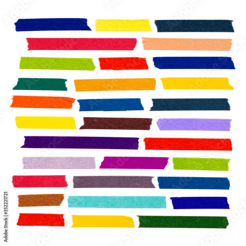 Collection of colorful adhesive tape pieces different size isolated on white background.