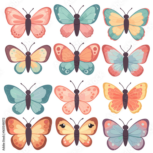 Collection of colorful butterflies with diverse wing patterns in a whimsical and vibrant vector illustration style