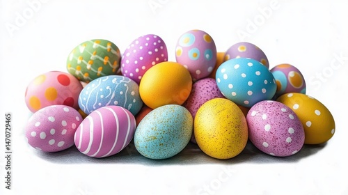 Collection of colorful decorated eggs with various patterns including dots, stripes, and speckles arranged closely together on a white background evoking a festive and cheerful mood