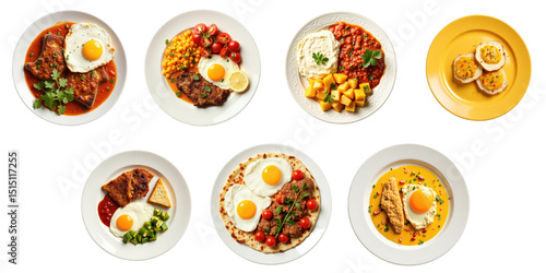 Collection of Colorful Dishes with Eggs Including Grilled Meats, Fresh Vegetables, and Savory Sauces Present on White Plates Against a transparent Background