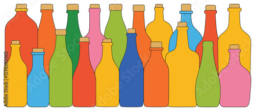 Collection of colorful glass bottles with cork stoppers arranged in a row