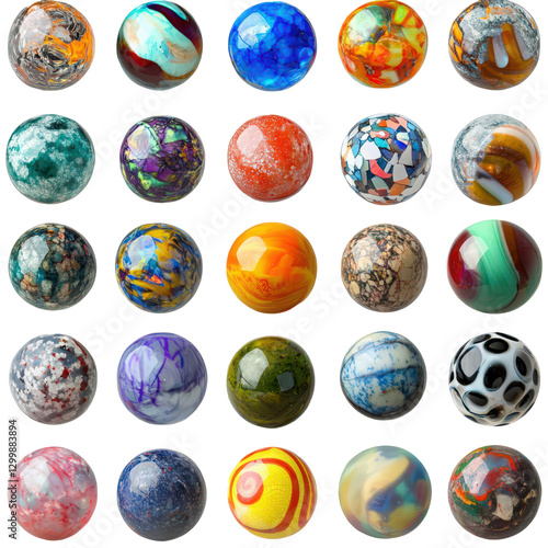 Collection of colorful glass marbles with unique swirl patterns, a vintage game concept