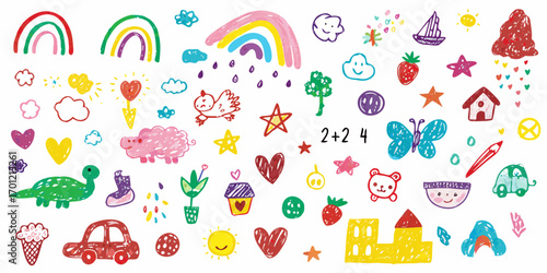 Collection of colorful hand drawn children s doodles featuring rainbows animals hearts and everyday objects on a white background