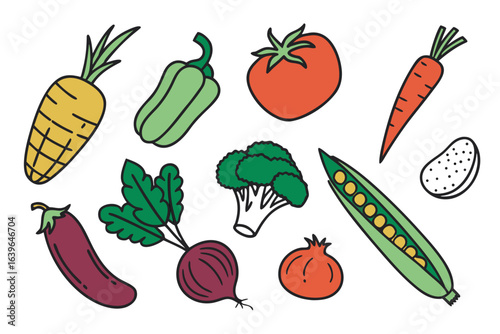 Collection of colorful hand drawn vegetables on a white background