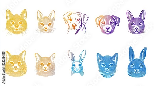 Collection of colorful pet portraits, including cats, dogs, and rabbits, rendered in a pointillist style against a white background. Each animal's