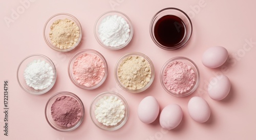 Collection of colorful powders and eggs for easter egg dyeing isolated on white background