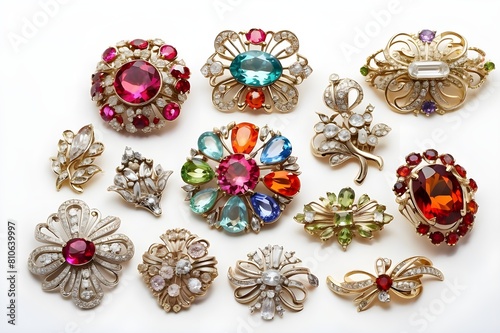 Collection of colorful vintage rhinestone brooches, on white, horizontal aspect