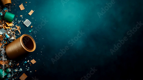 Collection of colorful waste materials scattered artistically on a teal background for creative recycling and environmental concepts.