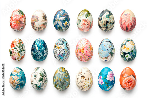 Collection of colourful hand painted decorated easter eggs isolated on white background