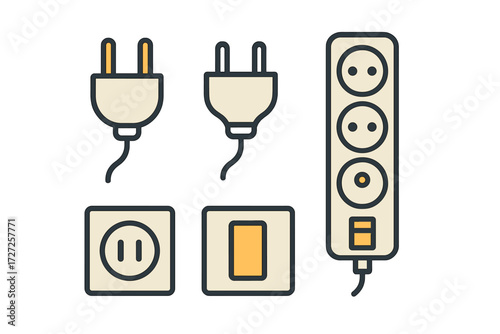 Collection of common household electrical power plugs, wall sockets, light switch, and multi-outlet power strip for home use