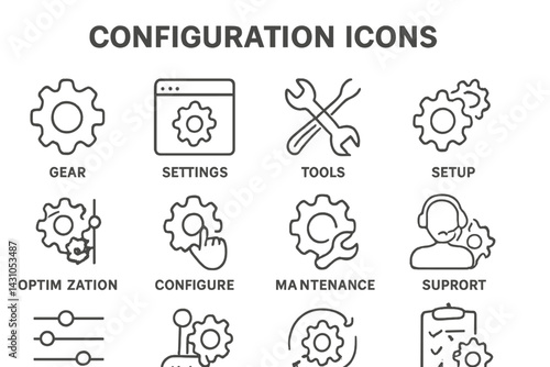 Collection of configuration icons featuring gears, tools, settings, and support symbols for digital applications