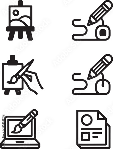 Collection of creative art and design icons featuring drawing painting and digital tools silhouette