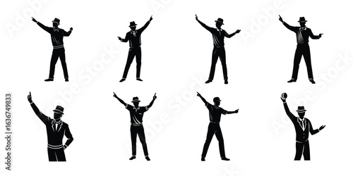 Collection of cricket umpire silhouettes making signals isolated on white background