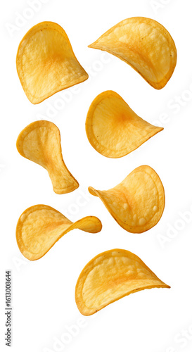 Collection of crispy potato chips snack food flying or falling. Isolated on transparent background, png