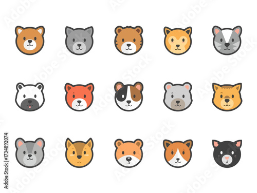 Collection of cute animal faces depicted with simple outlines and soft colors, showcasing a playful and cheerful mood.