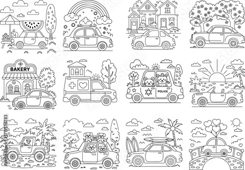 Collection of cute cartoon cars and vehicles for children s coloring pages isolated on white background
