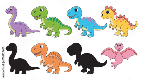 Collection of cute cartoon dinosaurs and their shadows. Educational matching game for kids. Vector illustration set