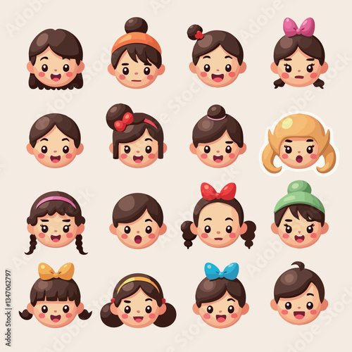 Collection of cute cartoon faces of girls with different hairstyles and expressions