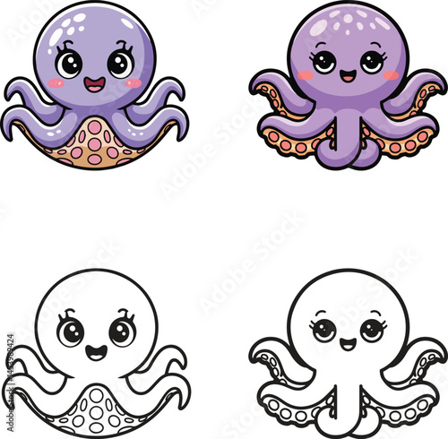 Collection of Cute Cartoon Octopus Vector Icon Illustrations Design Concept
