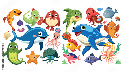 Collection of cute cartoon sea creatures swimming together underwater scene