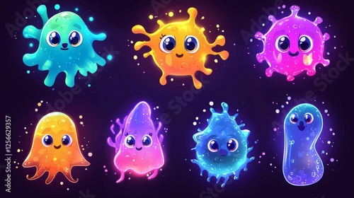 Collection of cute cartoon viruses with expressive eyes and vibrant shapes, glowing neon outlines, futuristic vibe