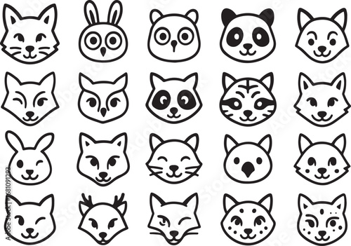 Collection of cute hand drawn animal faces including foxes cats pandas and rabbits adorable sketchy icons for design projects