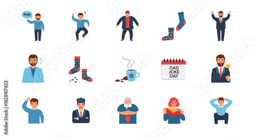 Collection of dad themed icons featuring men, socks, coffee, and a dad joke day calendar image