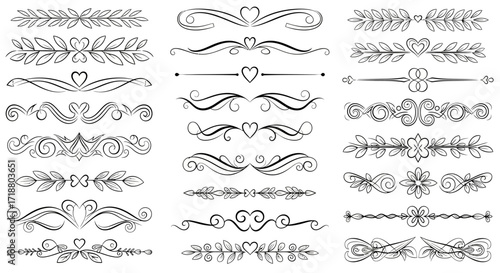 Collection of decorative dividers with floral and heart elements in black and white design style