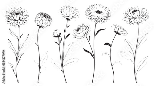 Collection of delicate hand drawn flower illustrations with detailed petals and leaves silhouette