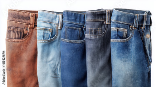 Collection of denim jeans in various shades, showcasing textures and styles, arranged neatly in a row, highlighting the versatility and fashion of denim wear