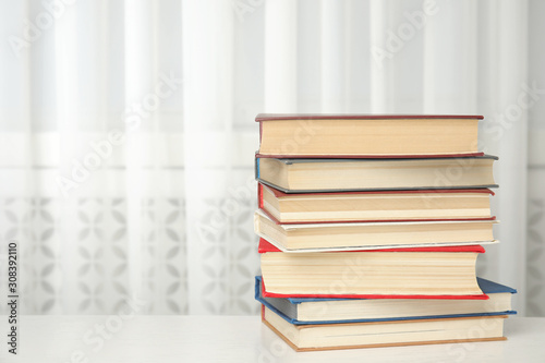 Collection of different books on table indoors. Space for text