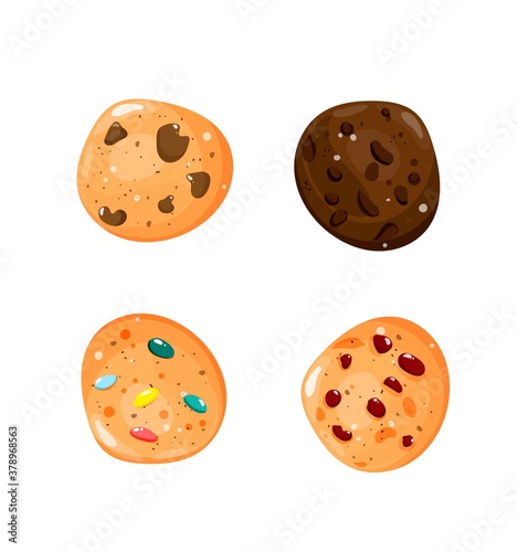 Collection of different oat cookies with chocolate chip, smarties, berries from a top view. Vector illustration. Clip art