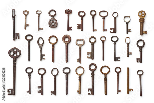 Collection of different old vintage keys isolated on white background