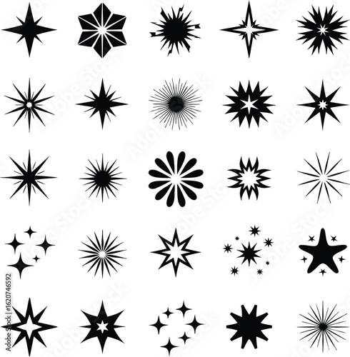 Collection of diverse black and white starburst and star shapes isolated on white background
