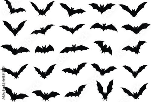 Collection of diverse black bat silhouettes in flight showcasing various wing positions and body shapes against a white background