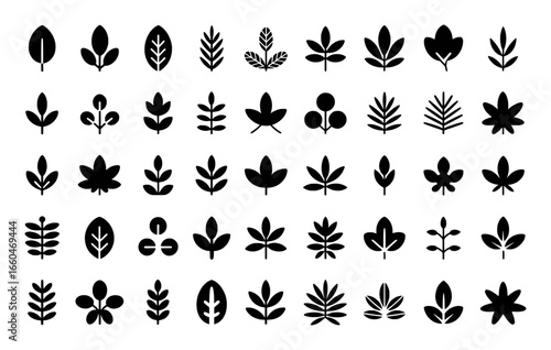 Collection of Diverse Black Leaf Icons on White Background