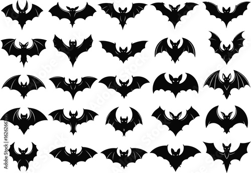 Collection of diverse black silhouette flying bats with textured wings in various dynamic poses against a white background