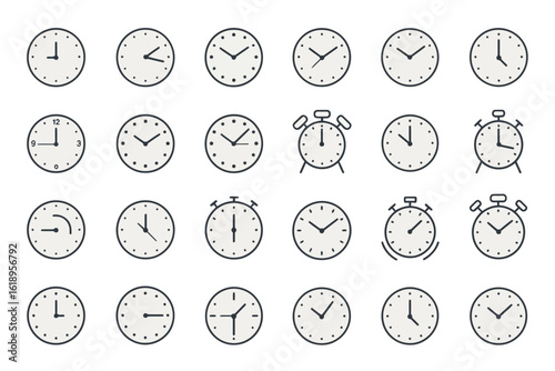 Collection of diverse clock icons showing different times and styles isolated on white background silhouette