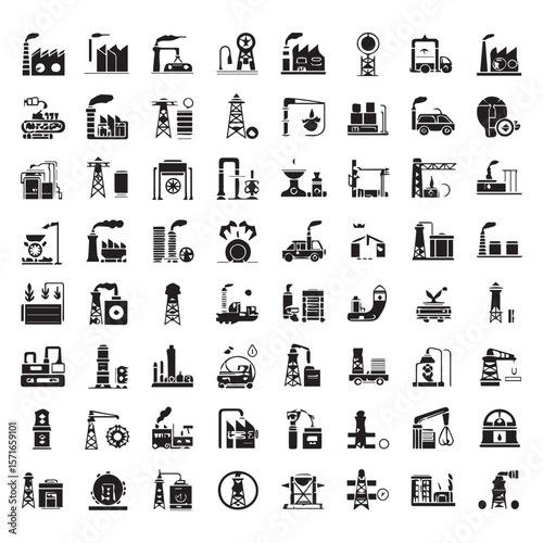 Collection of diverse industrial and factory icons representing manufacturing energy and production processes