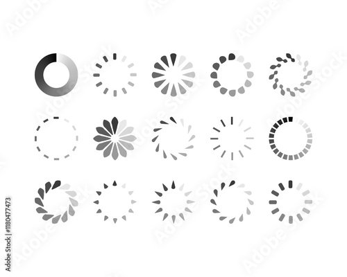 Collection of diverse loading icons in grayscale. Perfect for website design, app interfaces, or presentations needing visual progress indicators. Clean, modern style; easily customizable.