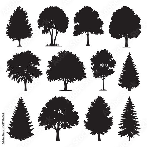Collection of diverse tree silhouettes set nature elements forest woodland flora isolated on white white background