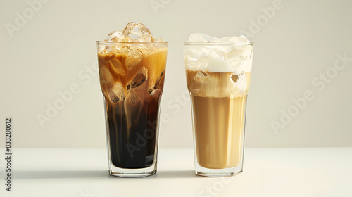 Collection of ebony cold brew and iced cappuccino with dairy in tall cup against plain backdrop,Set ice coffee and ice latte coffee with milk in tall glass isolated on white background
