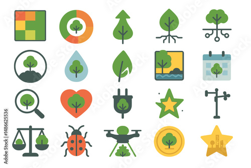Collection of eco-friendly icons representing sustainability and nature in a vibrant and colorful design