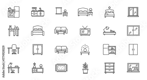 Collection of editable line icons representing various interior design elements, including kitchen appliances, bedroom furniture, living room seating, storage systems, and more, presented as a clean