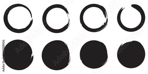 Collection of eight abstract black ink circles and brush stroke rings silhouette isolated on white background
