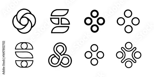 Collection of eight abstract geometric symbols isolated on white background, perfect for logo designs, modern icons, and creative graphic elements with a minimalist aesthetic